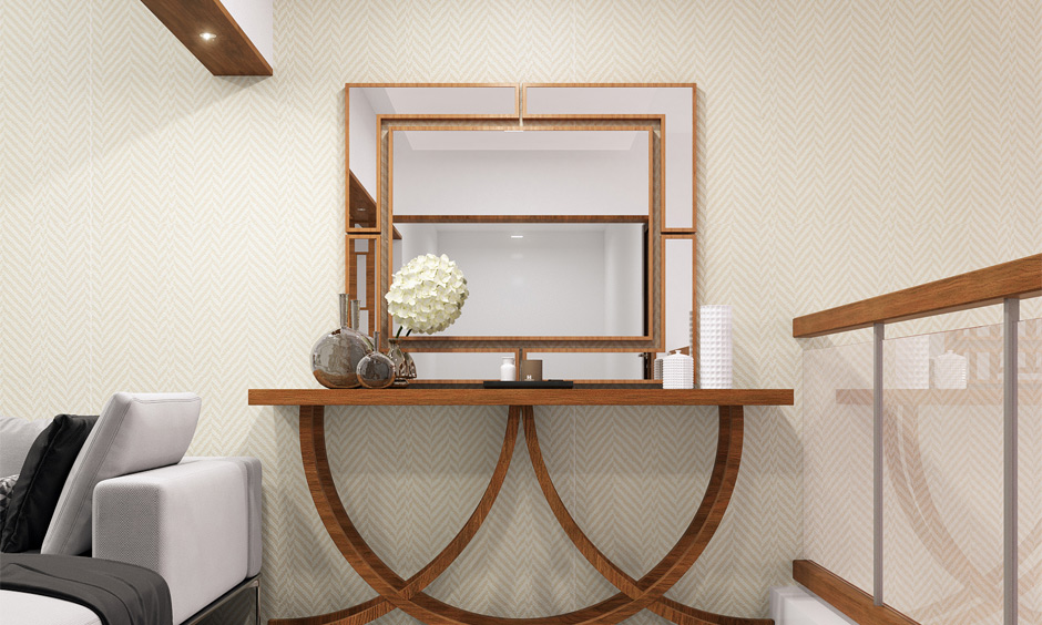 “Think big” is what we mean when we talk about a wall mirror in the living room. The living room’s square-cut wall frames give off the impression of a larger space by providing a panoramic perspective of the room ahead. It is a terrific way to instantly add grandeur to your home and looks incredibly lovely. With the addition of a fake ceiling and ambient yellow lighting, you can create the ideal setting for cozy get-togethers with loved ones.